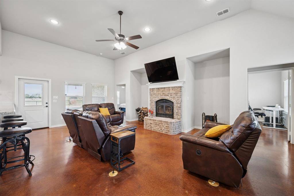 Set back from the road and framed by wide-open views, 2435 Cobler offers a blend of privacy, space, and convenience. The open-concept kitchen, dining, and living areas create a natural gathering space, complete with high ceilings, a brick fireplace, and generous natural light. The kitchen features white cabinetry, granite counters, a breakfast bar, and a 6-burner Thor range with griddle and dual ovens — a chef's dream for both everyday cooking and entertaining.