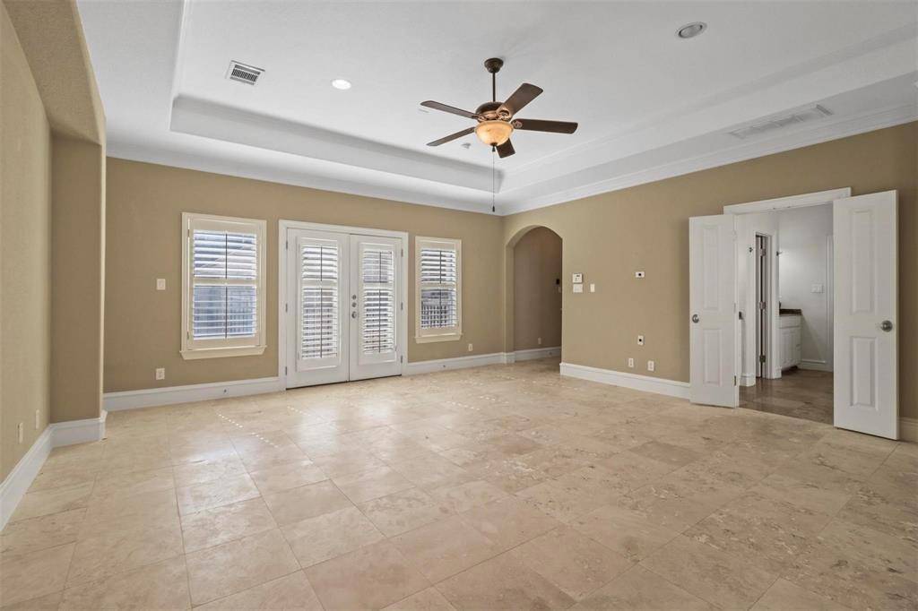 The executive study offers built-ins and French doors that open to a private fenced patio.