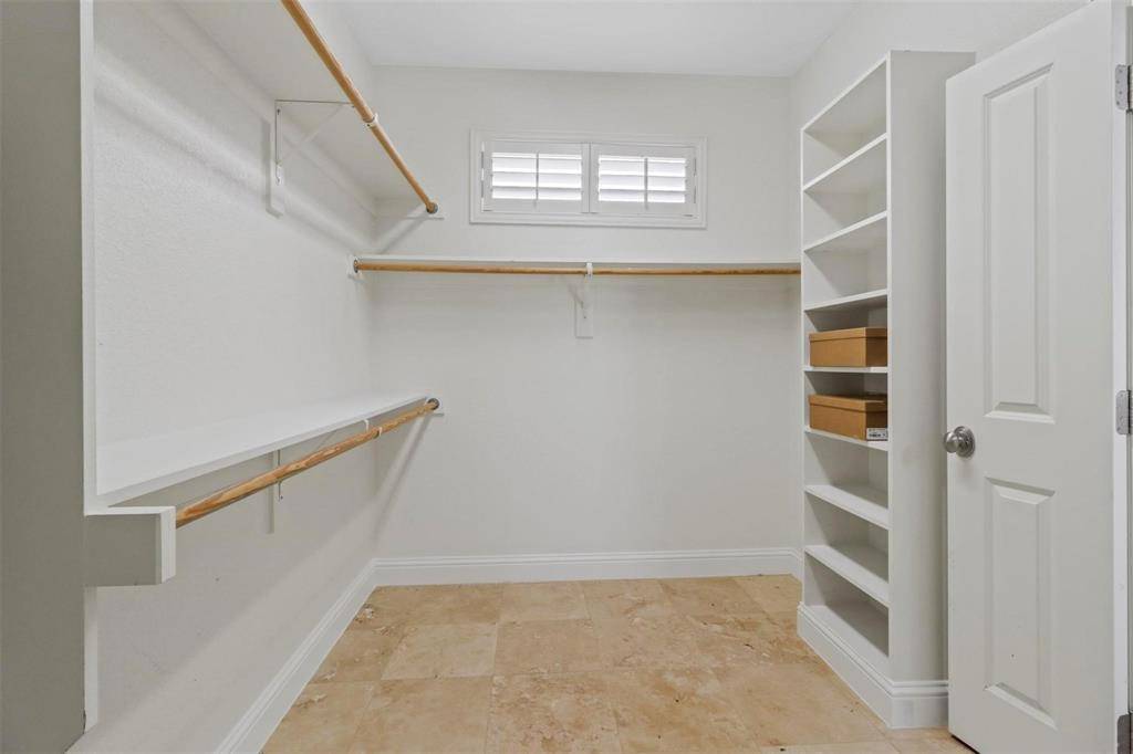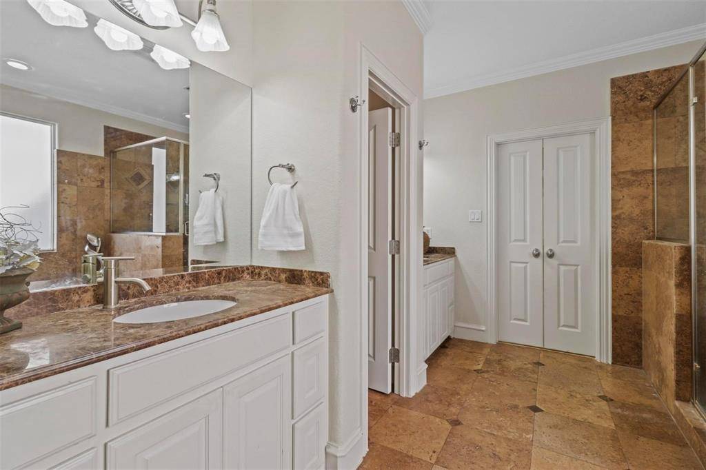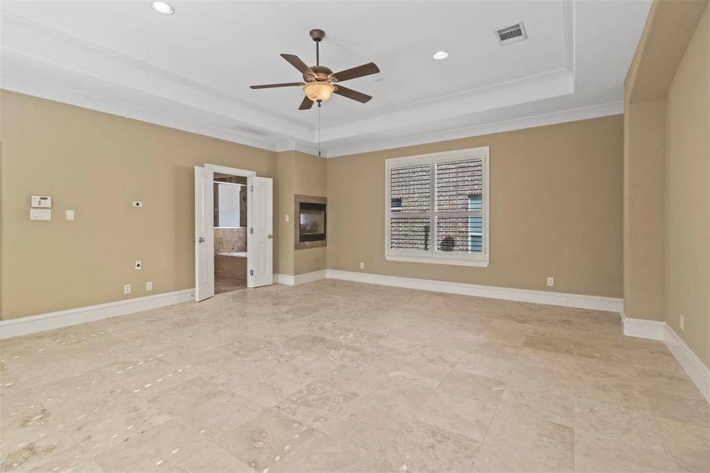 The owner's retreat impresses with travertine floors, a cozy fireplace, private balcony, spacious walk-in closet, and an ensuite bathroom with a jetted tub and separate shower.