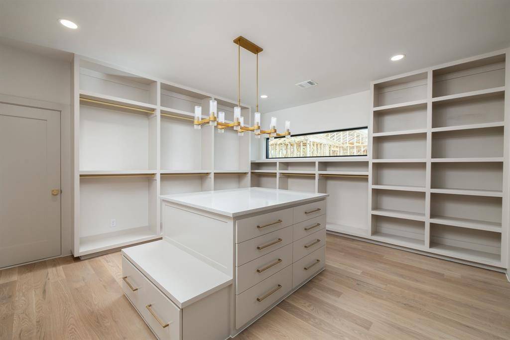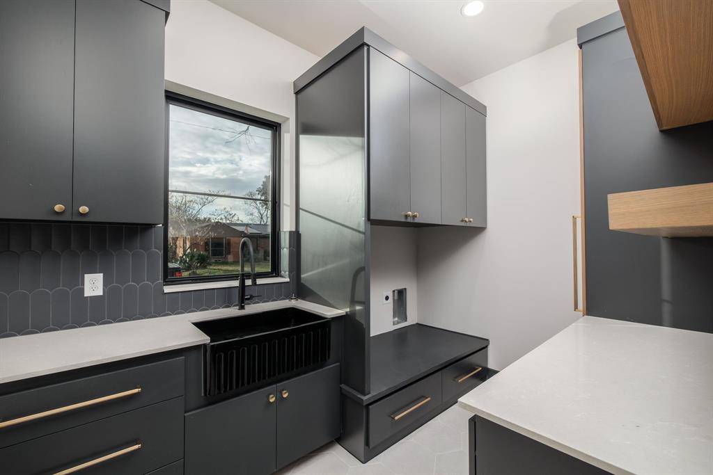 Designed for refined modern living, the residence features a first-floor primary suite with serene views of the backyard and pool, complemented by a spa-inspired bath and a striking custom two-story closet. Luxury finishes carry throughout, including wide-plank hardwood flooring, mitered-edge apron-front detailing, elevated lighting, and bespoke craftsmanship that create a cohesive, sophisticated interior.