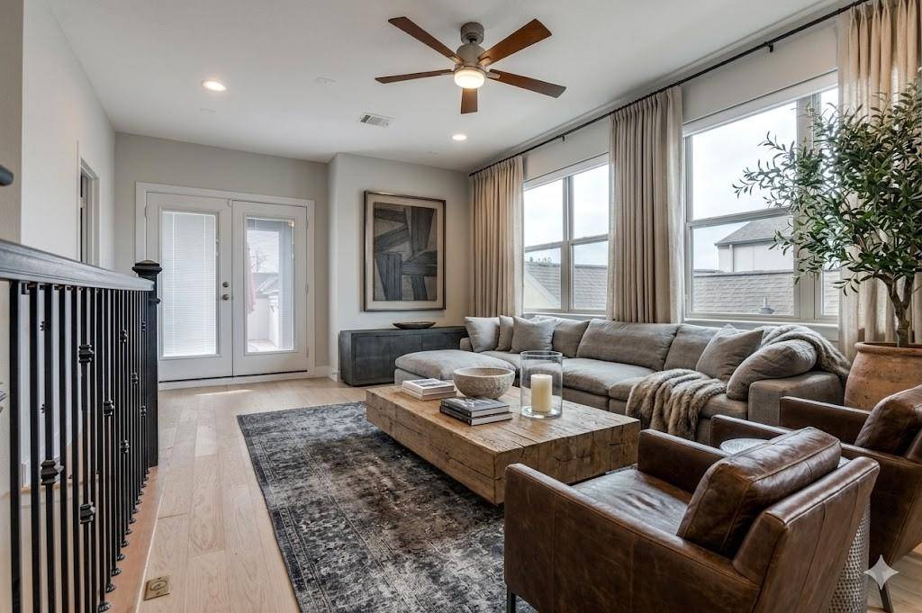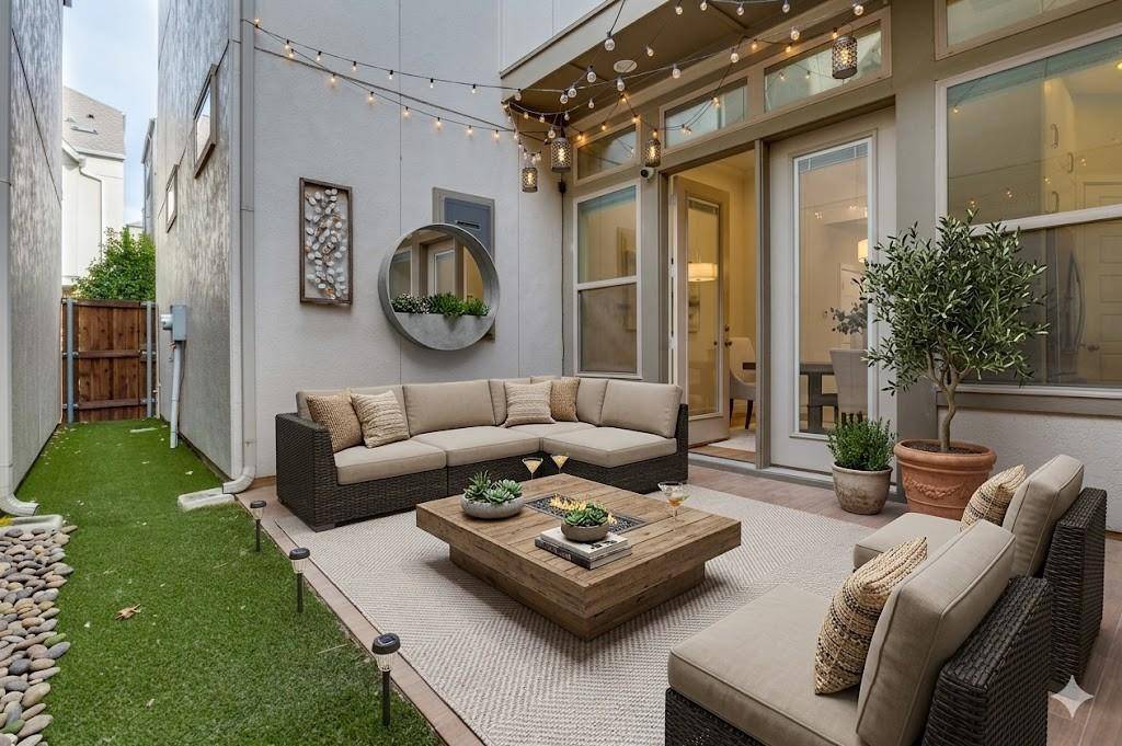 Stunning David Weekly home in Oak Park priced to sell, featuring breathtaking downtown views from the expansive third-floor patio. This thoughtfully designed residence boasts soaring ceilings, designer lighting, a fireplace, recently painted and brand-new engineered hardwood floors throughout. The open-concept layout is ideal for both entertaining and everyday living. The home offers three spacious bedrooms, including a large primary suite, along with two full baths and two half baths for added convenience. Enjoy low-maintenance outdoor living with a turfed front and side yard, perfect for relaxing or entertaining. Residents also enjoy access to a community pool, adding to the exceptional lifestyle this home provides. The third floor living has a half bath for convenience. An opportunity to own a stylish, move-in-ready home in a highly desirable communities close to shopping and easy to get to the tollroad and downtown. Refrigerator conveys with the property.