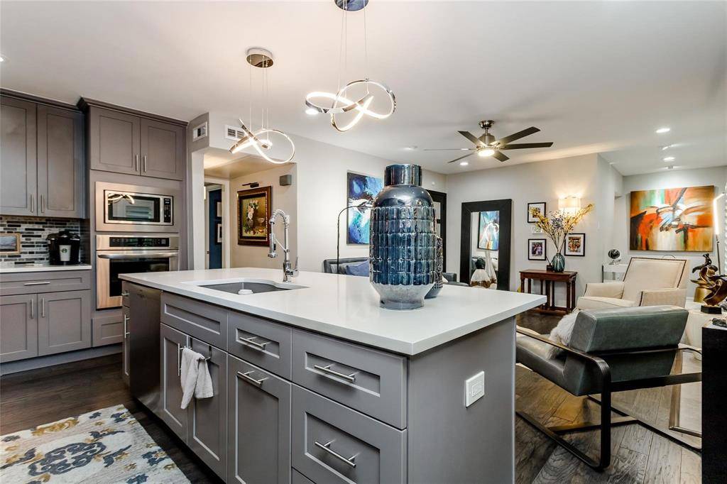 room windows that frame the serene view. The custom-designed kitchen is a true standout, featuring an entire wall of cabinetry,