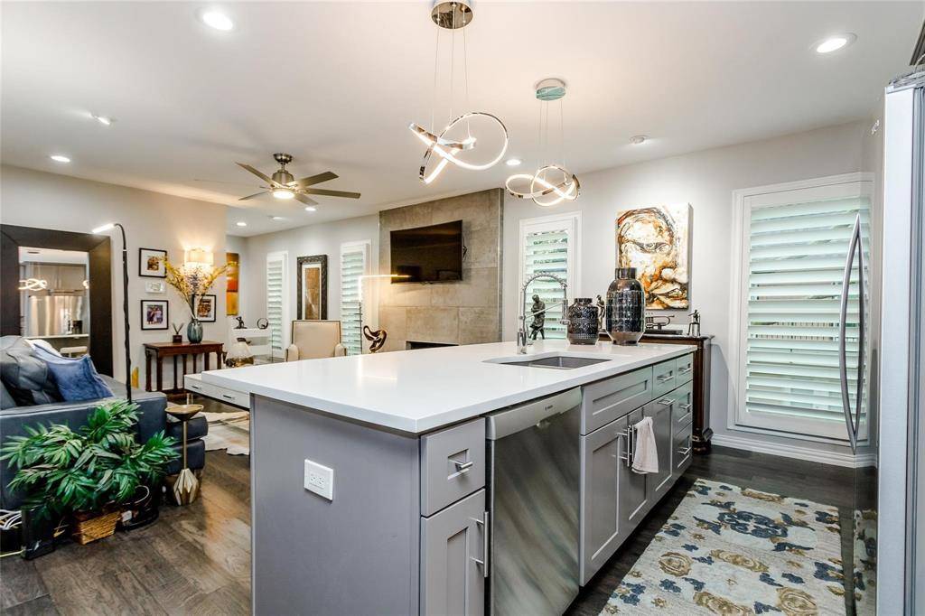 quartz countertops, and a stylish kitchen island, perfect for both cooking and entertaining. Down the hall, the guest bathroom has