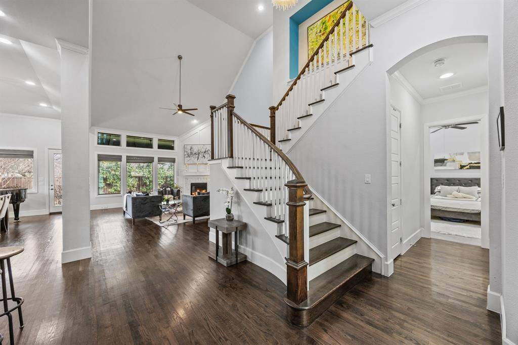 Located on a rare oversized 0.26-acre lot (73' x 155') in Lakewood's Bob O Links Downs, this 2015-built Hill Country–style residence offers 5 bedrooms, 6 baths, and approximately 4,129 sq ft of living space. A glass-paneled front door opens to a spacious entry and a dedicated home office with glass doors. The open-concept main level features rich hardwood floors, high ceilings throughout, and a gas fireplace anchoring the main living area.