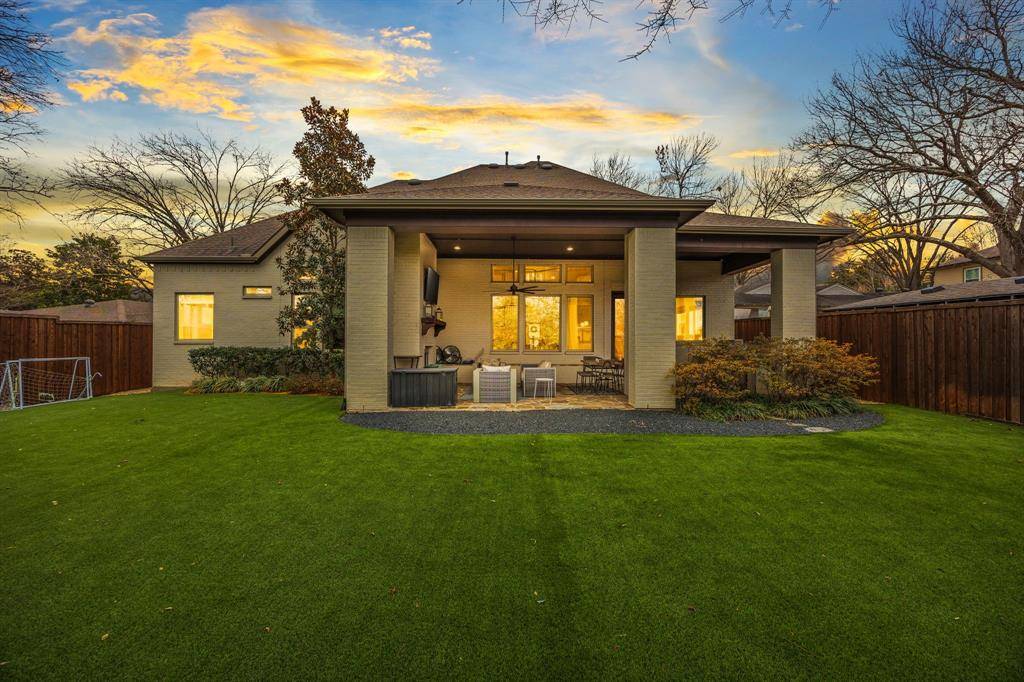 The kitchen is centered around an oversized marble-topped island with breakfast bar seating, abundant cabinetry, gas range, and GE Monogram appliances, creating a functional layout for everyday living and entertaining. French doors from the living area open to a covered backyard patio with gas fireplace, built-in grill, and outdoor refrigerator. The turfed, level oversized backyard includes a sprinkler system and board-on-board privacy fencing The first floor primary suite features a cathedral ceiling and spa-like primary bath. A guest bedroom and one and a half additional baths on the main level provide versatility for visitors or multi-use needs. Upstairs includes three additional bedrooms and a large playroom or bonus space. Attached side-entry three-car garage and ample storage. Located minutes from White Rock Lake, Lakewood shopping and dining corridors, and nearby parks. Includes 3D walkthrough and virtual tour media. Oversized lot dimensions, outdoor living features, and a flexible floor plan distinguish this property within the Lakewood area. Seller to replace carpet or provide buyer a closing cost credit. This is one you won't want to miss!