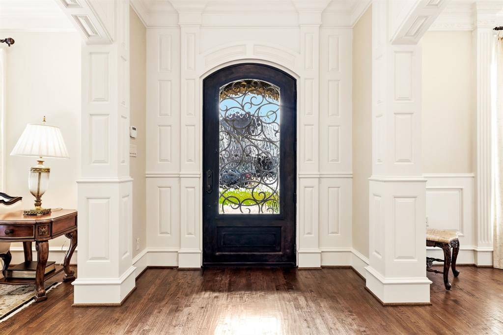 A grand entry with sweeping staircase introduces expansive formal and casual spaces, including three distinct living areas and a private study. Rich hardwood floors, custom millwork, and abundant natural light continue throughout the home.
