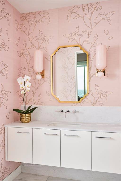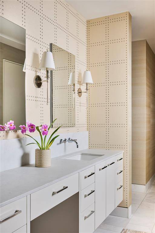 Completed in 2024, the residence reflects over $400,000 in owner-selected upgrades, elevating it beyond the already high-end developer standard. Fine wall coverings, including Phillip Jeffries treatments, antique Murano glass accents, and custom millwork create a layered, sophisticated interior. A fully integrated AV system and extensive custom storage enhance functionality.
