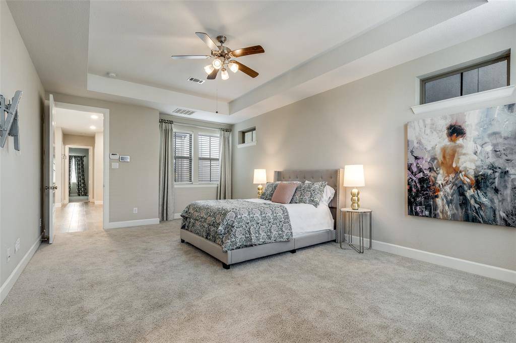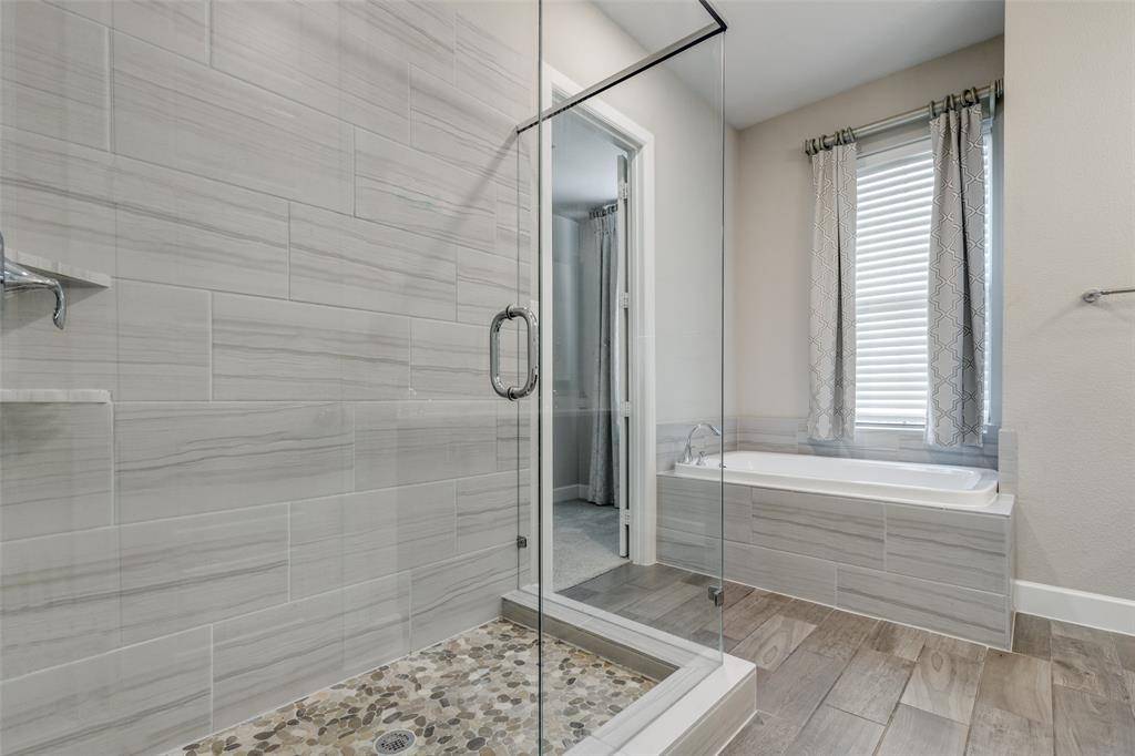 The spacious primary suite offers a private retreat complete with a luxurious en-suite bath featuring a soaking tub, separate shower, dual vanity, and a generous walk-in closet with direct access to the laundry room for added convenience.