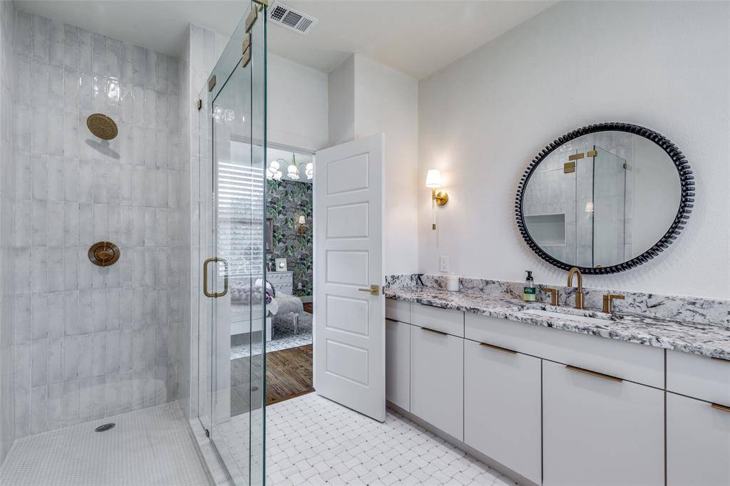 SELLER OFFERING $20K CREDIT IF UNDER CONTRACT BEFORE APRIL 20. Nestled in the heart of Midway Hollow, this stunning modern transitional residence has been meticulously renovated and thoughtfully expanded, blending timeless design with elevated, luxury finishes. With over $500k invested in renovations, customizations, and additions, every detail has been curated to deliver both beauty and functionality. Flooded with natural light, the open concept floor plan is anchored by handscraped hardwood floors and expansive living spaces designed for effortless entertaining. The chef's kitchen is a true showpiece, featuring high end appliances, a commercial style range and vent hood, abundant custom cabinetry, and a stylish bar area adorned with custom wallpaper. Large windows frame serene views of the deck and sparkling pool, creating seamless indoor outdoor flow. The first floor offers exceptional flexibility, with two private guest suites, each with its own full bathroom. One includes builtin cabinetry, making it ideal for a sophisticated home office. A convenient downstairs laundry room adds everyday ease. Upstairs, the oversized primary suite is a luxurious retreat with custom cabinetry, a spacious sitting area, and abundant natural light. Spa inspired primary bath showcases designer wallpaper, expansive vanities, and a generously sized walk in closet. Two additional oversized guest bedrooms feature large closets and beautifully appointed ensuite bathrooms. A second, expansive laundry room with custom storage, along with two versatile upstairs living areas, provides exceptional comfort and functionality for modern living. The outdoor living space features a retractable awning with integrated heaters creating a versatile setting. Just beyond, the heated pool provides a private resort style escape, surrounded by lush landscaping that enhances both beauty and privacy. Positioned near Central Market, DNT, and Dallas' premier private schools.