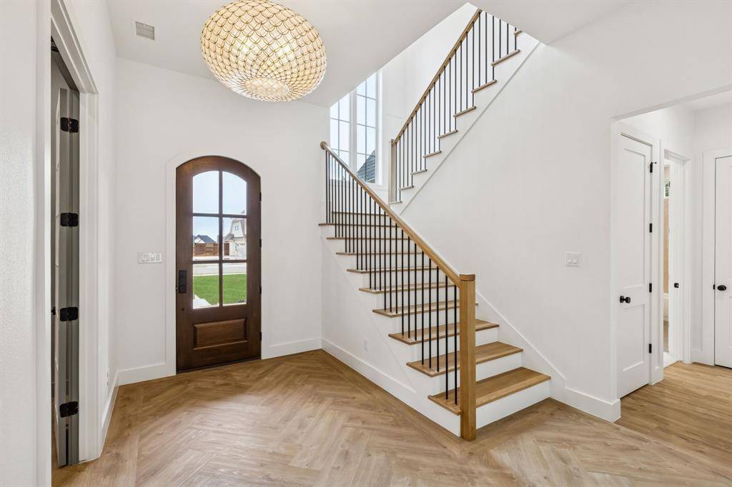 Inside, a light-filled foyer with warm wood flooring and a statement chandelier sets the tone. The staircase features natural wood treads and sleek black balusters, offering a sophisticated transition between levels. The home then opens into a breathtaking great room with soaring ceilings and expansive sliding glass doors that flood the space with natural light and connect seamlessly to the covered patio beyond.