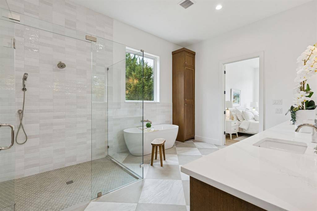 The private primary suite offers a serene retreat with spa-inspired bath, dual vanities, soaking tub, and a spacious walk-in shower. Additional bedrooms and flexible living spaces provide room for guests, work, or media, adapting beautifully to your lifestyle.
