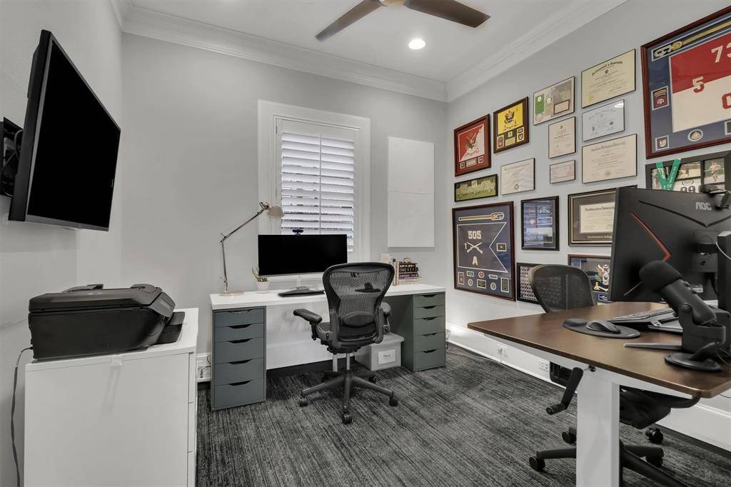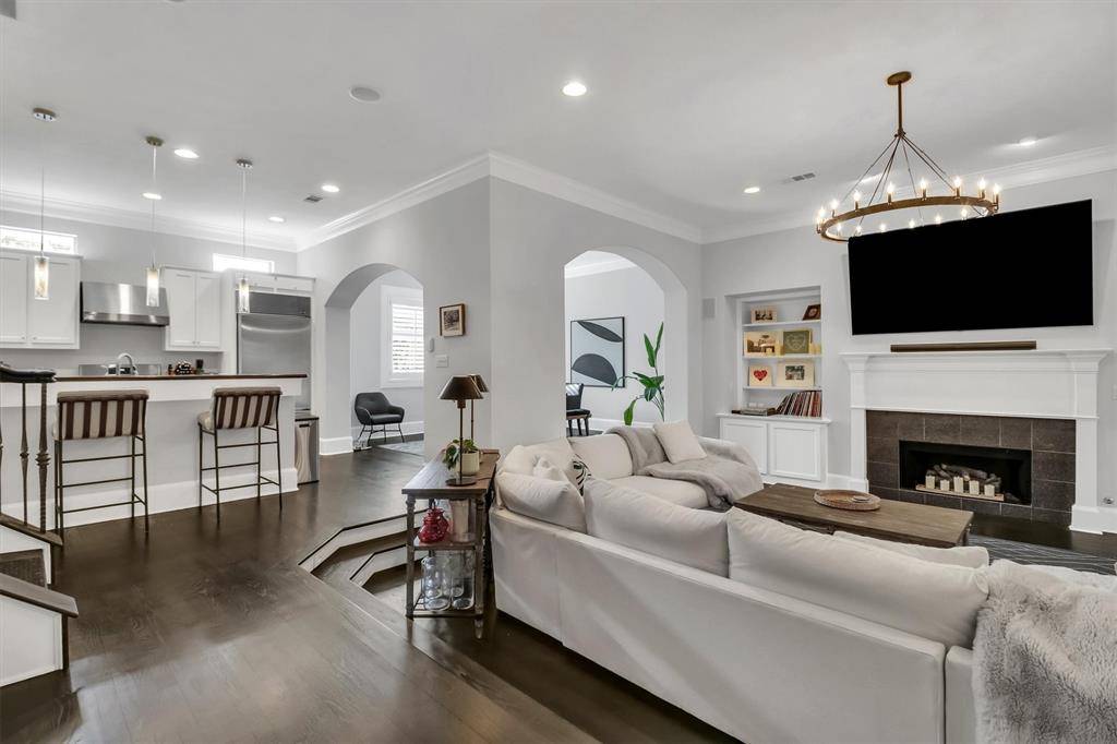 Stunning 3 story townhome with views of downtown Dallas & a low HOA! This beautifully maintained residence offers a versatile layout with quality finishes throughout. The 1st floor features 2 spacious bedrooms with rich wood floors and a full bath with elegant travertine flooring & walkin shower...perfect for guests, roommates, or a private retreat. On the 2nd level, enjoy an open-concept living space designed for both comfort and entertaining. The living room showcases a cozy fireplace, built-in cabinetry, and a stylish dry bar. The dining area is highlighted by decorative lighting, while the kitchen impresses with granite countertops, stainless steel appliances, white cabinetry, and abundant natural light. Plantation shutters add charm and privacy. This level also includes a dedicated office space, a convenient half bath, and access to a covered balcony for relaxing outdoors. The 3rd floor primary suite is a true sanctuary, complete with two walk-in closets and a luxurious bath featuring travertine flooring, granite countertops with dual sinks, a walk-in open shower, and a standalone soaking tub. Additional highlights include dual staircases, a rooftop patio with a turfed area, and breathtaking views of downtown Dallas. The exterior combines timeless stucco accents with brick for striking curb appeal. A small gravel dog run adds extra convenience for pet lovers. This exceptional townhome blends style, functionality, and location—don't miss your opportunity to own a sophisticated urban retreat!