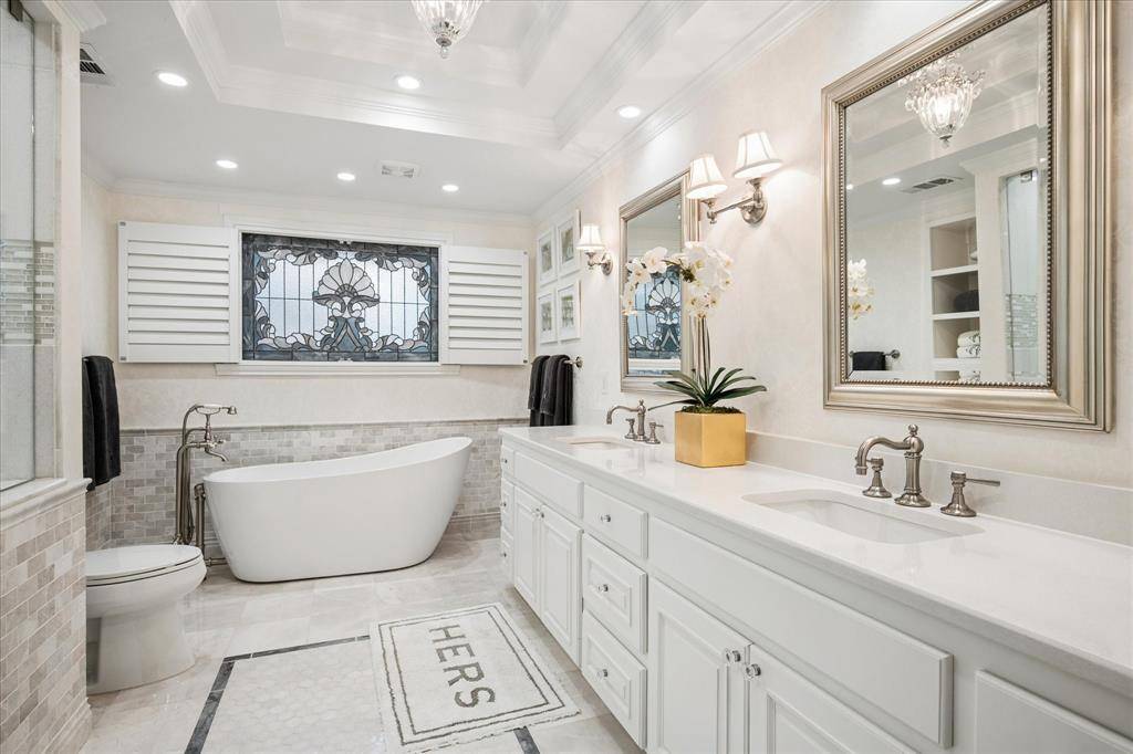 The primary suite is a serene retreat with a fully updated ensuite bath showcasing a freestanding soaking tub, separate shower, and modern finishes. An additional secondary bedroom also enjoys its own ensuite bath, offering comfort and convenience.