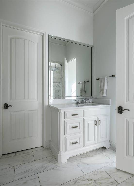 The first floor includes the primary suite and a guest suite, all with en-suite baths. The primary retreat offers a private sitting room with fireplace, dual spa-like bathrooms, and two expansive walk-in closets. Upstairs, three additional en-suite bedrooms are joined by a large game room with private balcony and a dedicated fitness room.