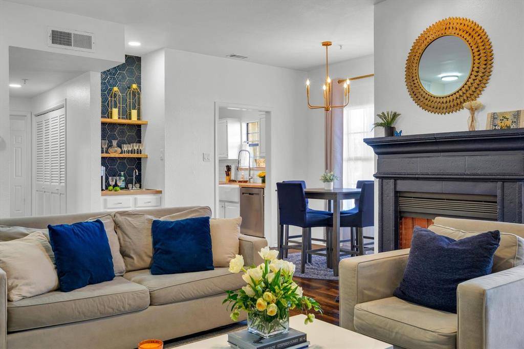 Welcome to this MOVE-IN READY rare first-floor condo offering modern comfort and unbeatable convenience in a prime location zoned for Armstong Elementary in Highland Park ISD! This beautifully designed newly renovated in 2024 2-bedroom, 2.5-bath residence features a highly desirable layout with two spacious bedrooms, each with its own private ensuite bathroom, plus a convenient guest half bath. The open living area is highlighted by a fireplace, stylish wet bar, and large windows that bring in natural light while offering peaceful treed street views. The kitchen features ceramic tile flooring, updated appliances, and a designer sink, creating a clean and modern feel. The primary bedroom includes walls of mirrored closet doors, enhancing both storage and light, while the ensuite bath provides comfort and privacy. Step outside to enjoy the covered patio, perfect for relaxing or entertaining. Additional highlights include two covered parking spaces located near the stairwell, updated lighting, ceramic tile in the kitchen and bathrooms, and thoughtful modern touches throughout. Ideally located within walking distance to SMU, restaurants, and shopping, this home offers both lifestyle and convenience in one of the area's most sought-after locations.