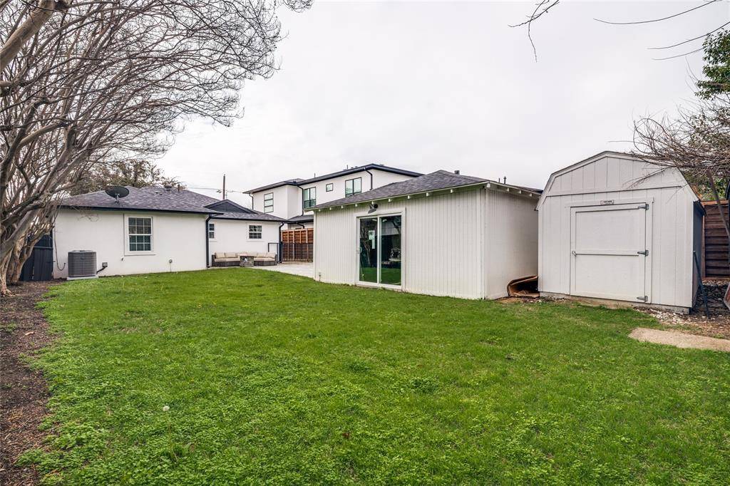 This jewel-box bungalow is located in Little Preston Hollow, one of Dallas' early suburban neighborhoods originally developed as three charming streets. Today the area is experiencing a building renaissance due to its prime location—just one block east of ESD and one block west of some of Dallas' most prestigious estates. This modern home is essentially like new, featuring a reinforced foundation and durable Portland cement stucco exterior. The home was completely remodeled in 2023, including the roof and roof deck, HVAC system, plumbing, electrical, and gutters.The oversized kitchen features stainless steel Samsung appliances with a gas range, wine bar, quartz countertops, and custom cabinetry. New energy-efficient windows were installed throughout in 2023. Matte-finished Italian marble floors run throughout the main living areas and bathrooms, complemented by Level 5 museum-finish walls.The spacious primary suite includes a large walk-in closet. A Samsung washer and dryer have been installed for turnkey convenience.Additional features include a storage building located behind the detached two-car garage. Gated backyard with patio area.