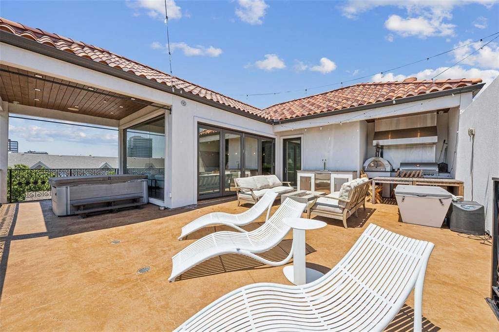 The crown jewel of the home is the 5th-floor rooftop oasis—complete with a full granite bar, fire pit, pizza grill, lounge seating, and hot tub—all perfectly positioned to capture panoramic downtown views. Whether hosting a party or enjoying a quiet evening under the stars, this space is the ultimate destination for elevated Dallas living.