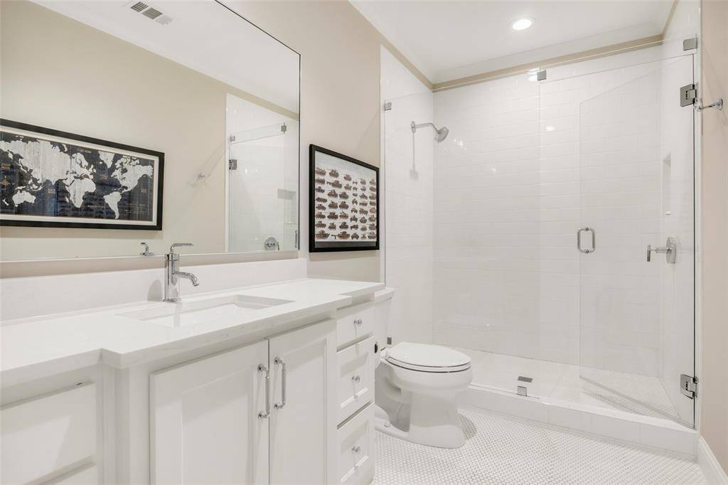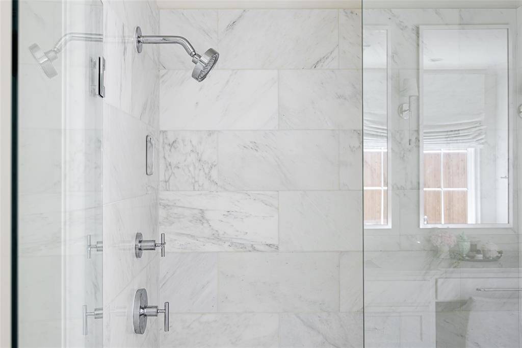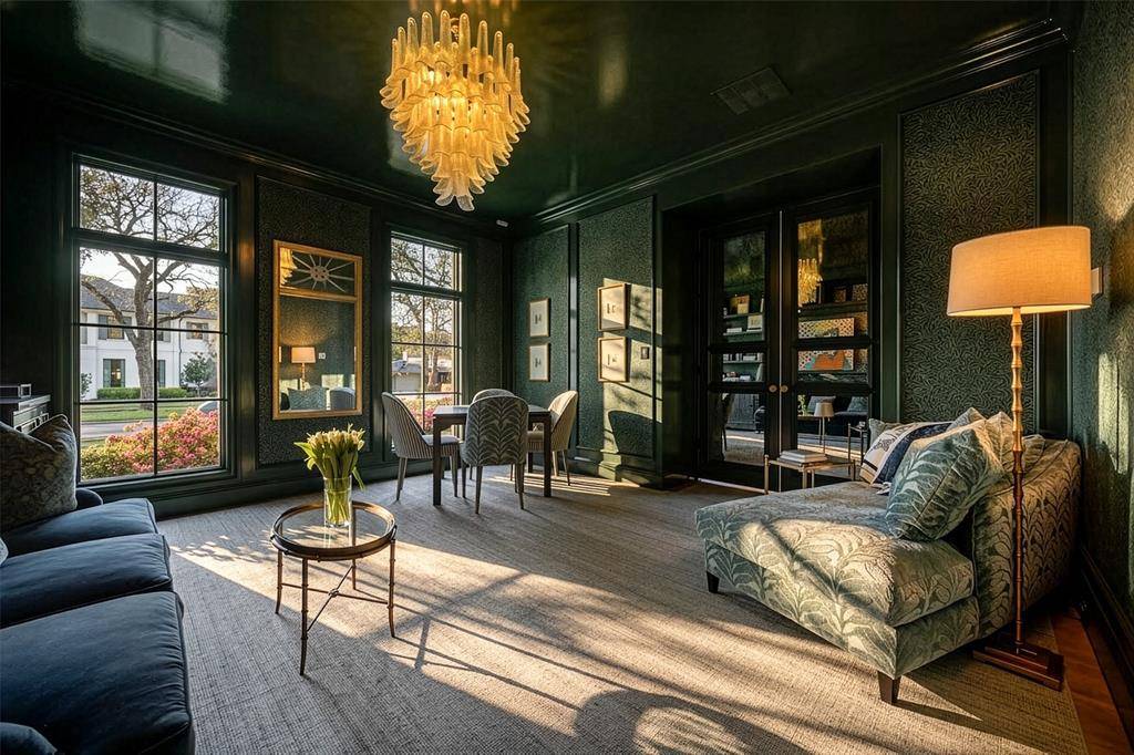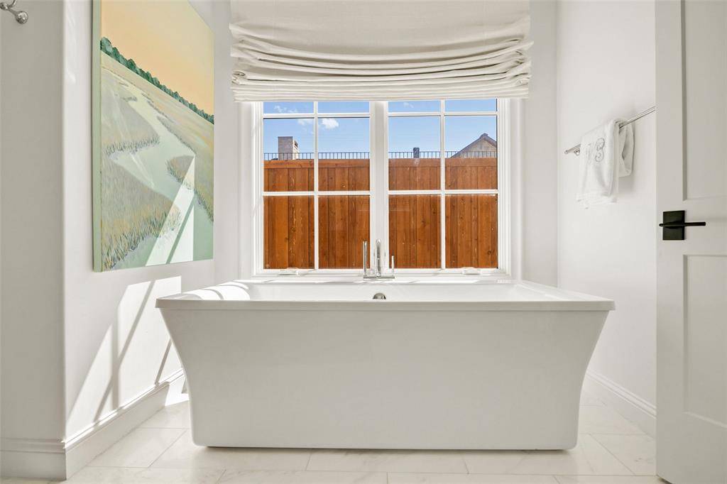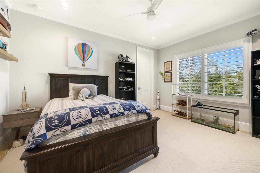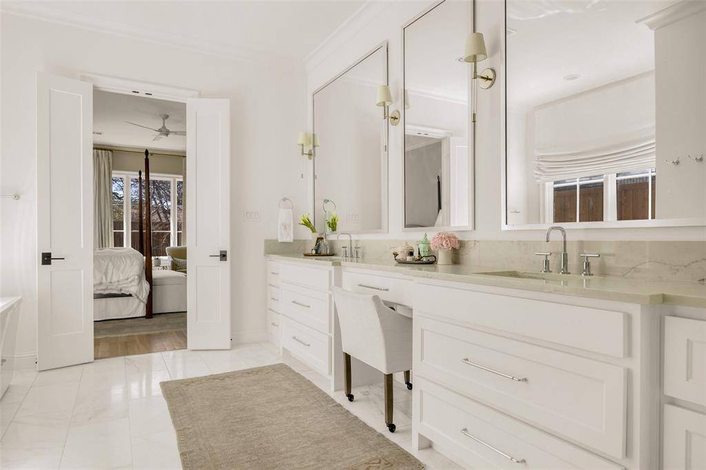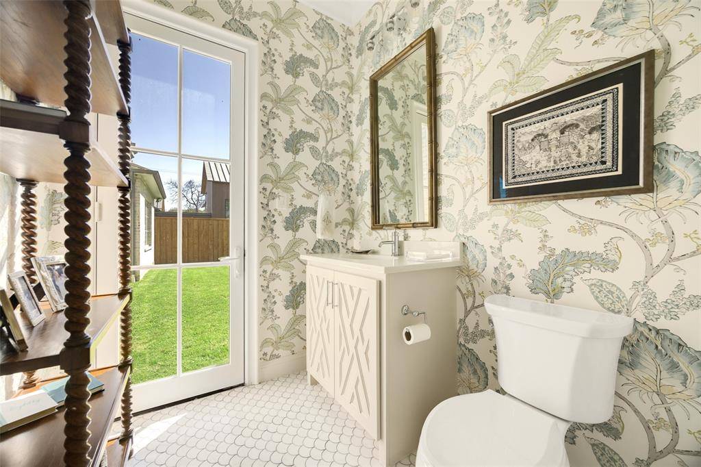 The Bird Streets 2 story home with 5 bedrooms, 5 bathrooms, 2 half bathrooms and a dedicated study, located just blocks from the Dallas North Tollway with quick access to Downtown Dallas, Dallas Love Field Airport and only 1 mile from all of the restaurants and shopping at Inwood Village and Highland Park Village. Built in 2021 and set on an oversized 105x160 lot, this residence brings together thoughtful custom design, expansive living space, and a location that can't be beat. The exterior immediately reflects the care that went into the design, with mature trees, arched architectural accents across the covered front porch, and a porte cochere leading to the 3 car garage. Inside, the entry introduces the home with herringbone wood flooring and an intricate wrought iron railing along the staircase. The main living spaces unfold around a spacious living room anchored by a fireplace and a wall of windows that bring in natural light while looking out to the backyard. The kitchen sits just off the living room and offers both generous workspace and gathering space, centered around a large island with breakfast bar seating along with quartz countertops, tile backsplash, shaker cabinetry, double ovens, a gas cooktop, butler's pantry with an additional 2 refrigerator drawers and high end stainless appliances. The primary suite is located on the main floor with an ensuite bath that includes a walk in shower and a standalone soaking tub. Upstairs, 4 additional bedrooms each with their own ensuite bathroom. A large game room adds another gathering space for movies, games, or relaxing with friends and family. The backyard opens into a covered back patio, with a fireplace and grilling area, and a grassy yard with plenty of room to add a future pool. Additional upgrades include a water filtration system and a 24 kw home generator. Living in The Bird Streets places dining, business districts, and travel within easy reach while still enjoying the space and scale this home provides.