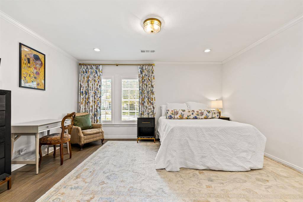 Inside, the light-filled living spaces showcase gleaming hardwood floors and plantation shutters, creating a warm and welcoming atmosphere. The updated kitchen, equipped with a Sub-Zero refrigerator, flows effortlessly into the den and master suite, both offering serene views and direct access to the outdoor entertaining area. The spacious master suite is a peaceful retreat with a cozy sitting area, an expansive walk-in closet, and a luxurious white marble bath featuring dual sinks and a separate shower.