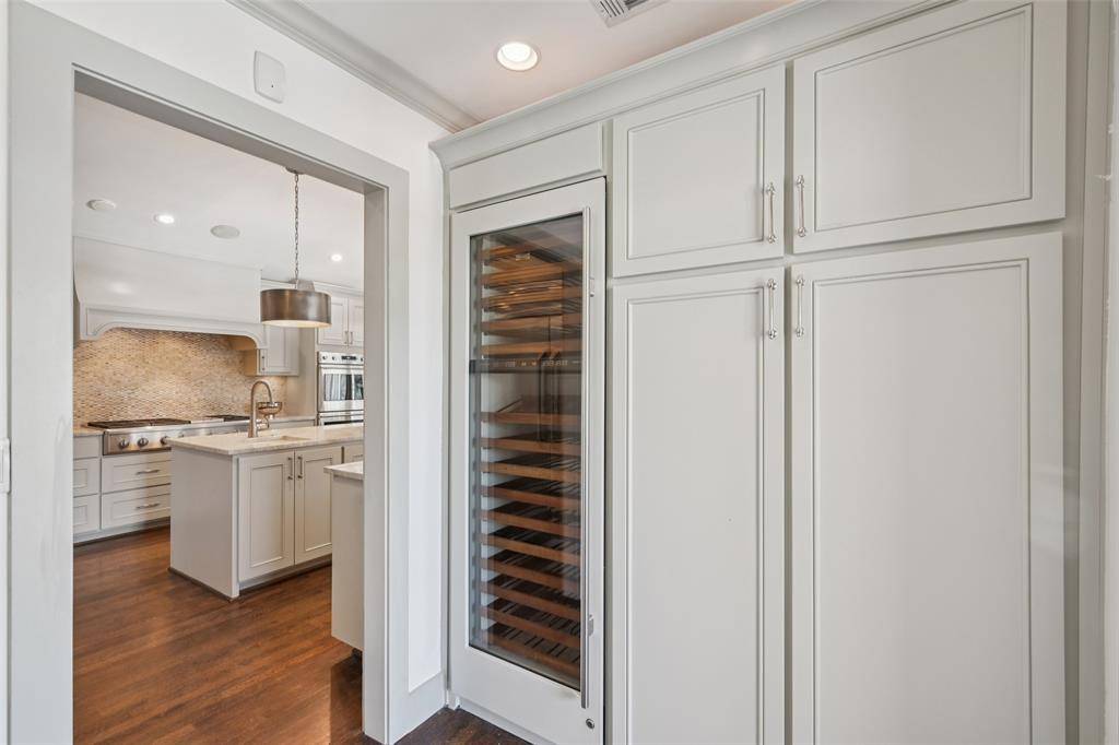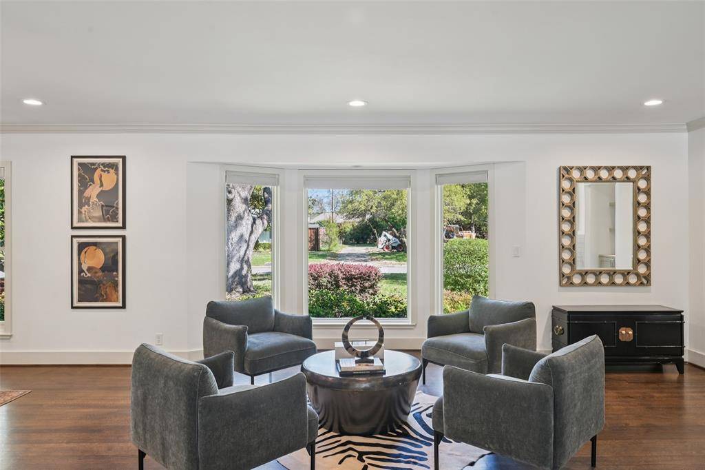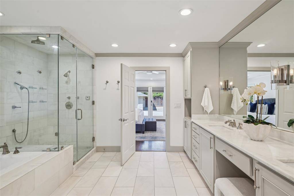 Stunning, thoughtfully designed open-concept home situated on a 120x150 foot lot in one of Dallas' most sought-after neighborhoods. Built in 1956, this single-story home offers exceptional curb appeal, multiple entertaining spaces, and over 500 square feet of covered outdoor living. Off the entry, you'll find a formal living room and an inviting family room featuring vaulted ceilings, custom built-ins, and a gas fireplace. These spaces flow seamlessly into the formal dining room and a beautifully appointed chef's kitchen. The kitchen is equipped with an expansive island, two dishwashers, built-in refrigerator, beverage refrigerator, double ovens, microwave, and an impressive walk-in pantry area with built-ins and a full-size wine refrigerator. An adjoining breakfast room completes the space. Adjacent to the kitchen is a spacious game room with built-ins and a full bath—ideal for entertaining or flexible living. The private primary suite is tucked at the rear of the home, offering serene views of the sparkling pool, plus a generous walk-in closet. The luxurious primary bath features high-end marble finishes, dual vanities, a jetted tub, and a sep shower. Two secondary bedrooms, both with walk-in closets, share a Jack-and-Jill bath, while a third bedroom enjoys access to a full, hall bath. A large utility room, complete with built-ins and a sink, rounds out the interior of this home. The backyard is an entertainer's dream, showcasing multiple seating areas, motorized screens, a built-in grill, Green Egg cooker, beverage refrigerator, TV, and a wood-burning fireplace. The outdoor living space overlooks the resort-style pool with spa and water feature, along with a generously sized turfed yard. Additional highlights include Sonos speakers in the kitchen, primary bedroom, and patio; oversized 24x27 garage with workspace and storage; a gated driveway; and exterior security cameras. Ideally located near Preston Royal shopping & dining with quick access to the Tollway.