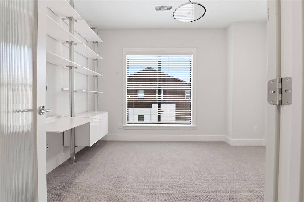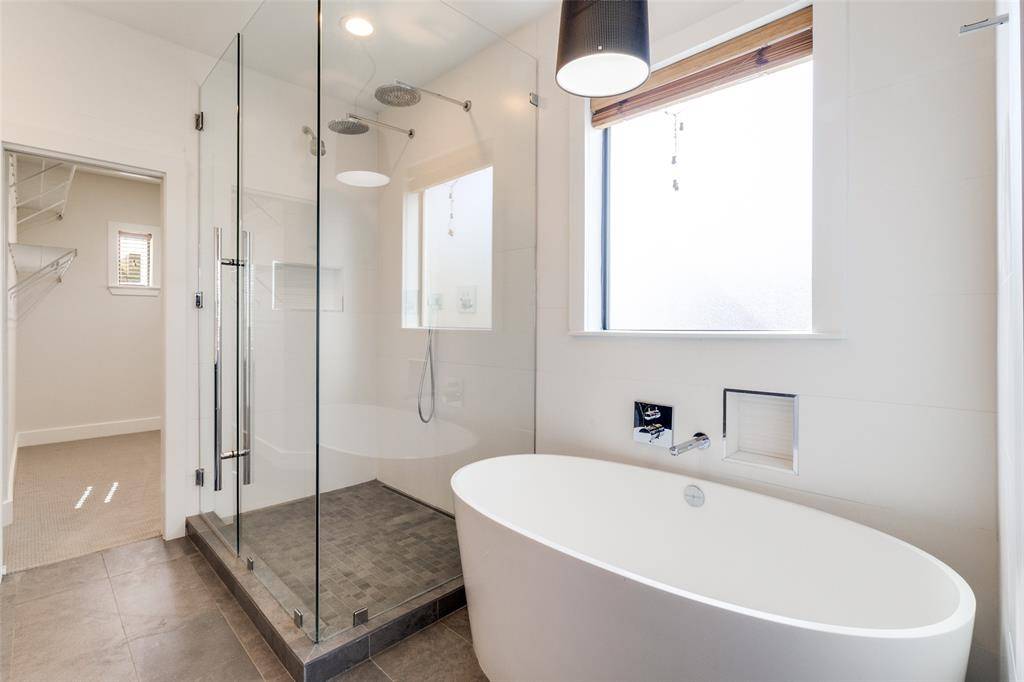 The third floor offers a built-in study by Ligne Roset and an oversized primary suite with multiple closets and a fully updated spa-inspired bath. Enjoy premium finishes including a Victoria and Albert volcanic limestone soaking tub, Porcelanosa tile, Toto toilet, a separate oversized shower, floating cabinetry with quartz countertops, and Robern AiO lighted medicine cabinets.