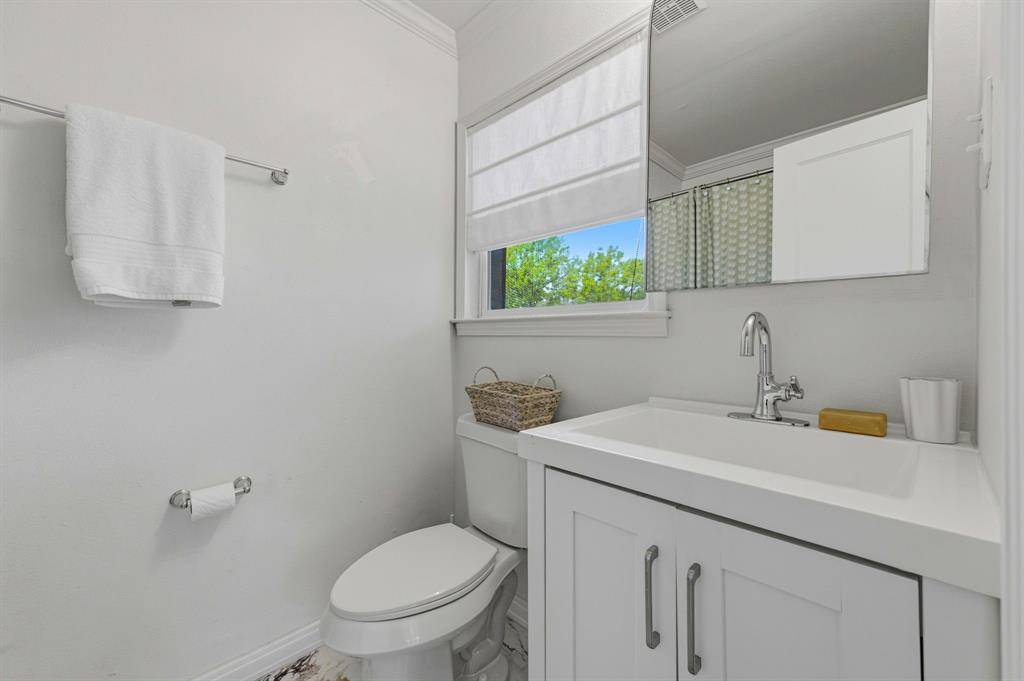 Just beyond the dining room, a versatile bonus room provides flexible space ideal for a home office, playroom, or secondary living area, with French doors leading to the backyard. The thoughtfully designed layout separates the bedroom wing from the main living areas for added privacy. Two secondary bedrooms share an updated full bath with marble flooring and classic white subway tile. The primary suite features abundant natural light and an ensuite bath finished with marble floors and timeless white tile.