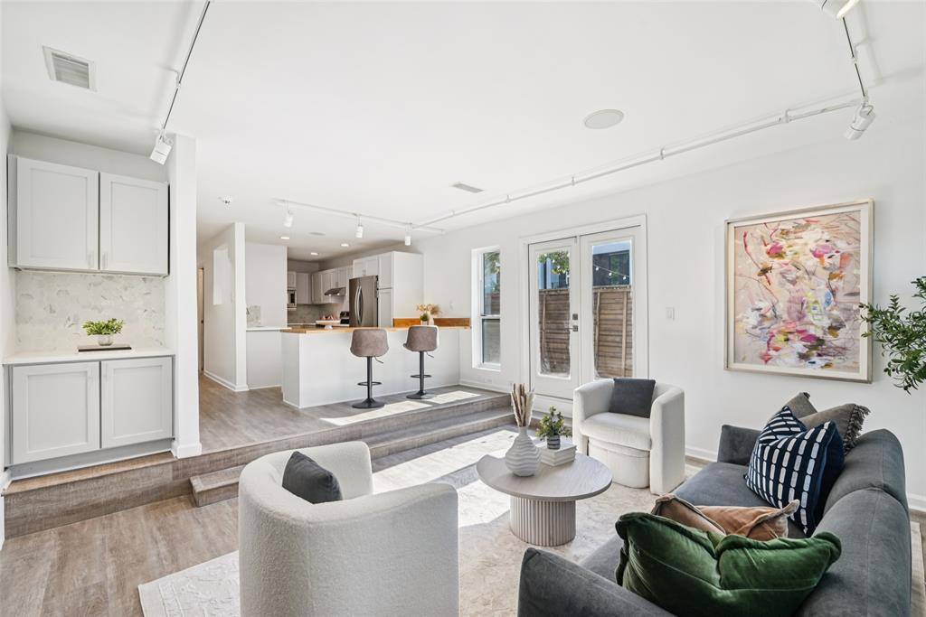 Inside, the newly redesigned kitchen steals the spotlight with expanded cabinetry, sleek quartz counters, a tile backsplash, and a butcher-block peninsula perfect for impromptu dinners or Sunday brunch. It flows into the living area, where a bold contemporary fireplace and French doors open to your own flagstone patio with wood privacy fencing—morning coffee, happy hour, or just a quiet escape.