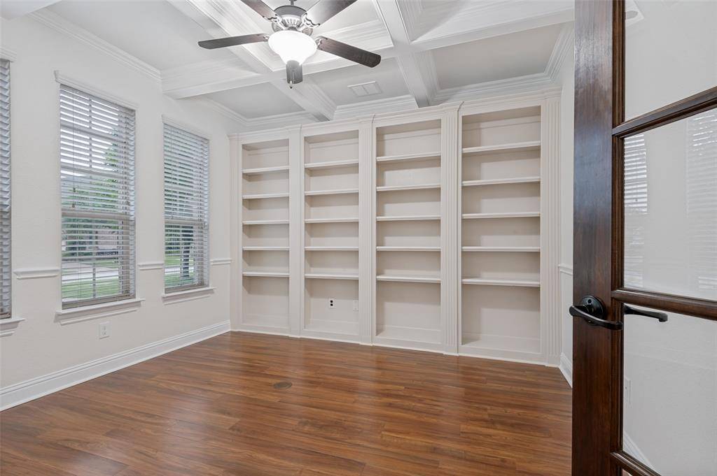 Enjoy the clean, elevated look of wood flooring throughout the main level, offering both style and practicality. The open floor plan features a private office with built-ins and a coffered ceiling, a formal dining room, and a stunning two-story living room with a floor-to-ceiling stone fireplace and abundant natural light.
