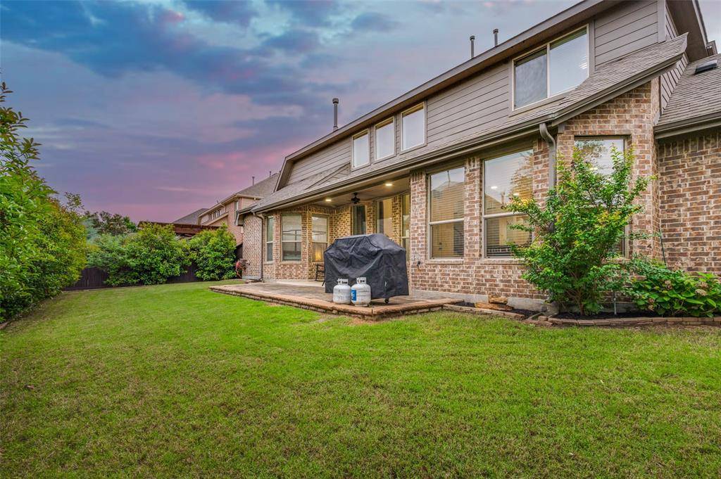 The backyard features an extended patio and a large grassy area for outdoor living, play, and pets.