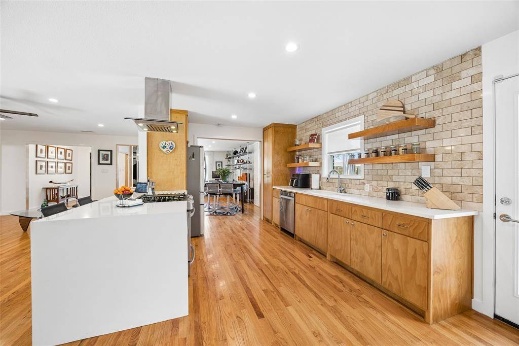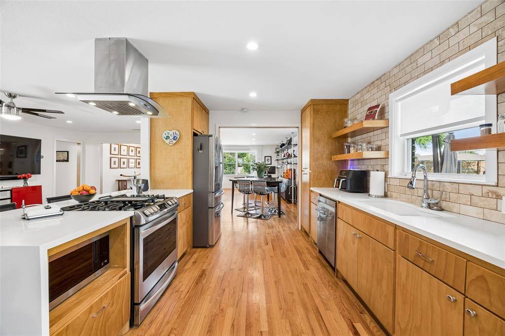 A spacious living area flows seamlessly into a well-designed kitchen, featuring quartz countertops, stainless steel appliances, custom handcrafted cabinetry, a full-height tile backsplash, and a functional breakfast bar.