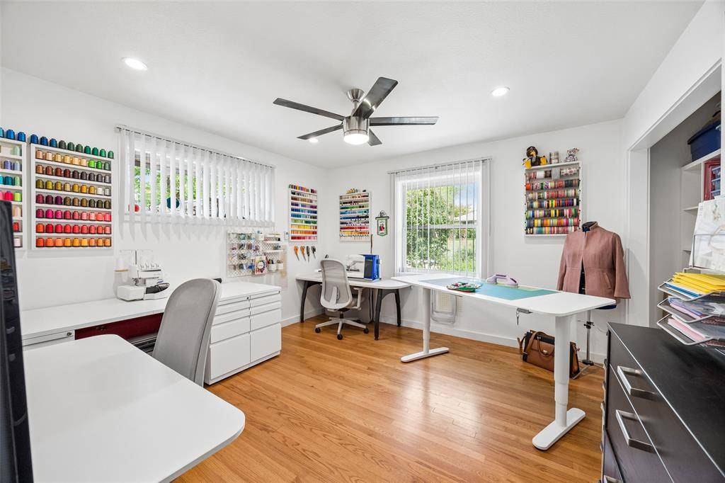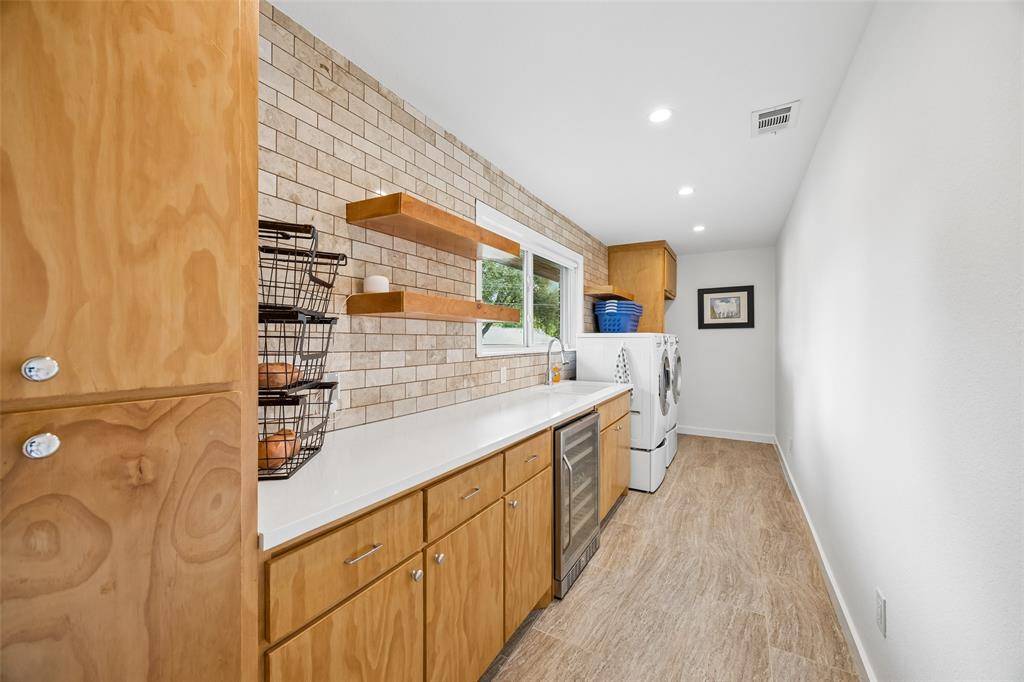 A versatile utility room sits just off the kitchen, featuring extended quartz countertops, custom cabinetry, full tile backsplash, built-in sink, beverage fridge, and a dedicated laundry area with ample storage.