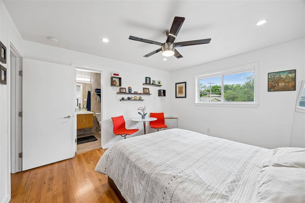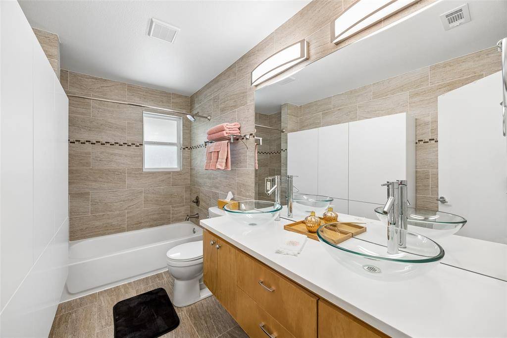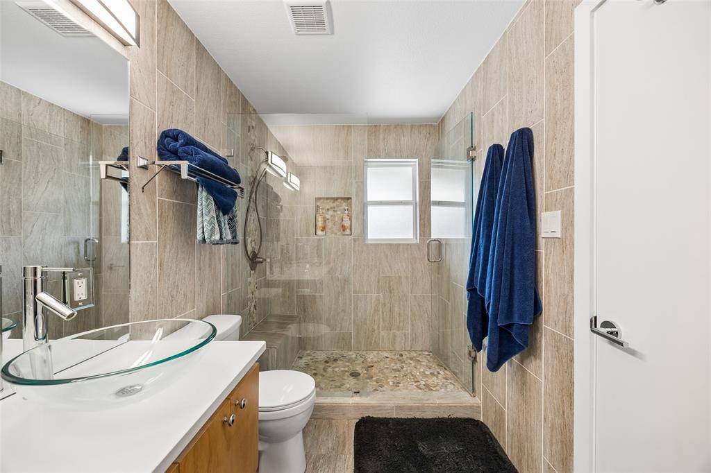The primary suite serves as a private sanctuary, highlighted by a spa-inspired bathroom with a cohesive neutral palette and refined finishes. Enjoy a frameless glass walk-in shower, floor-to-ceiling tile, dual vessel sinks, and modern fixtures throughout.
