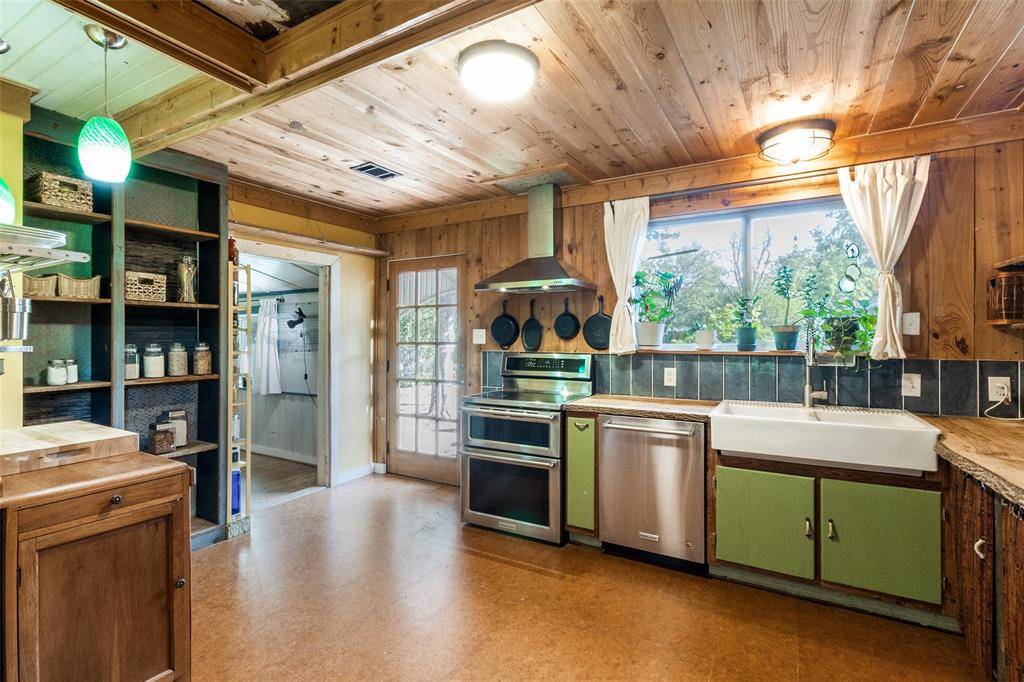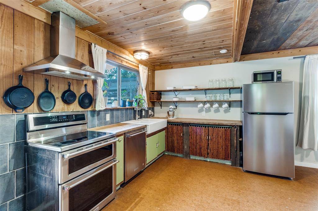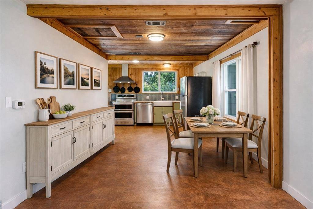 The adorable kitchen is both warm and distinctive, featuring open shelving, a 36-inch double basin farmhouse sink, and hand-hewn raw hickory countertops, beautifully complemented by barn wood planks that extend through the dining room, ceiling, and kitchen walls—creating a cohesive, rustic-modern aesthetic. Stainless steel appliances include a KitchenAid induction range with double convection ovens, dishwasher, and refrigerator, offering both style and high-performance functionality.