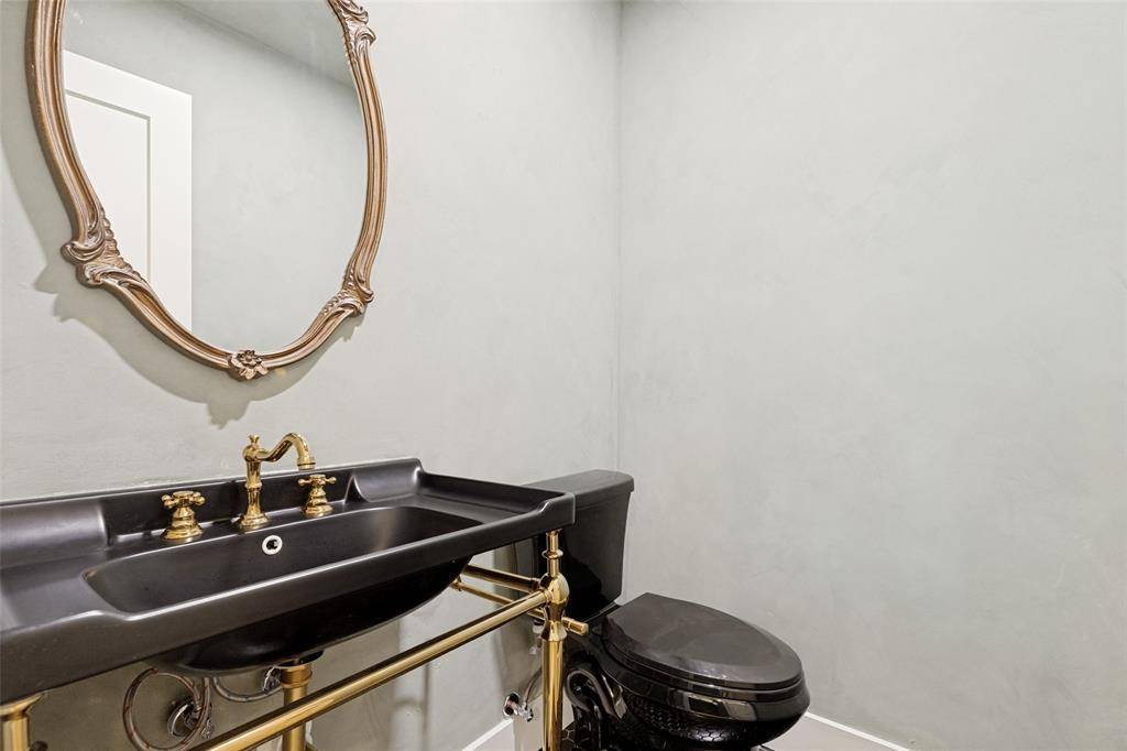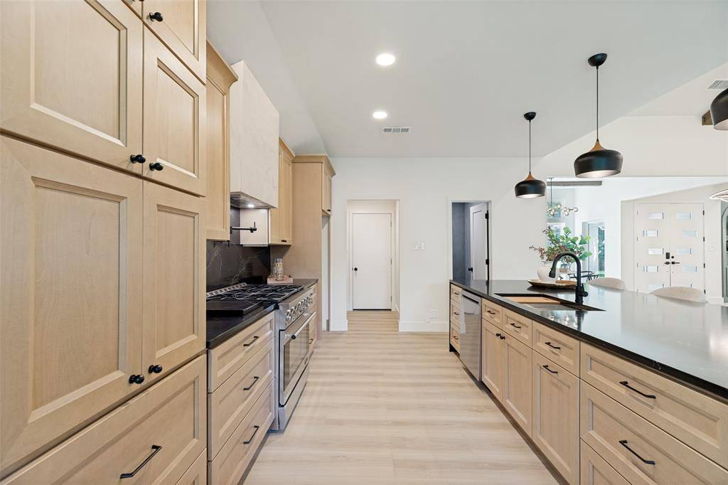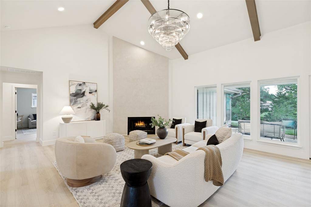 A Venetian plaster fireplace creates a striking focal point, while a lime-washed powder bath adds depth and texture. The chef-inspired kitchen anchors the home with custom warm oak cabinetry, black quartz countertops, and a 36-inch professional gas range.